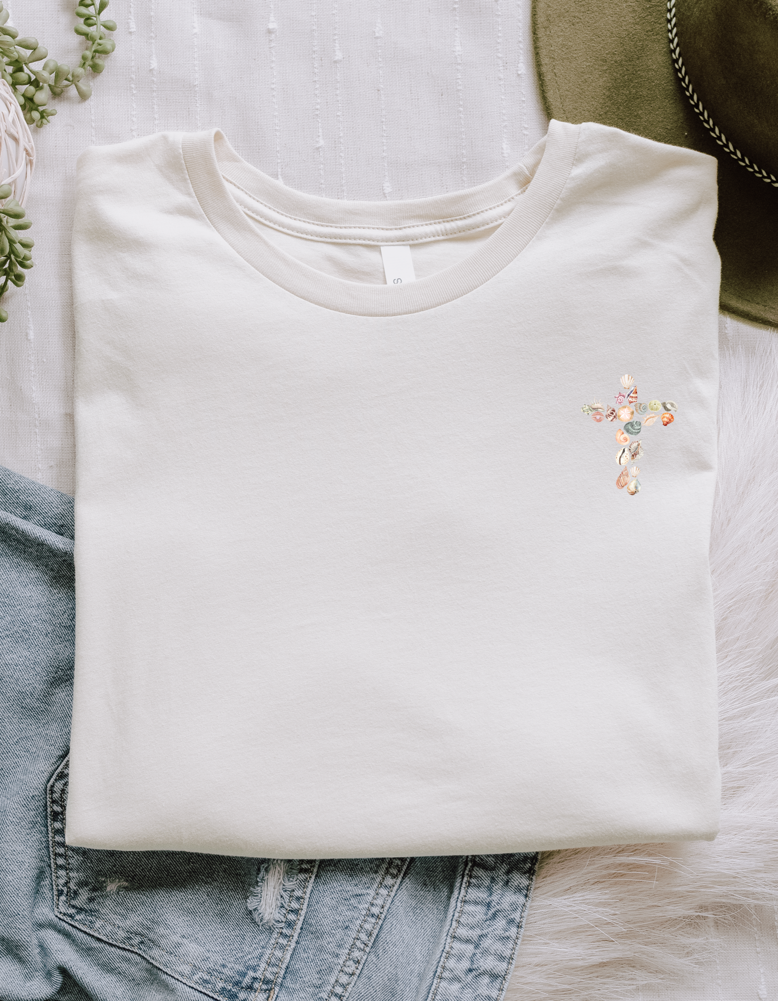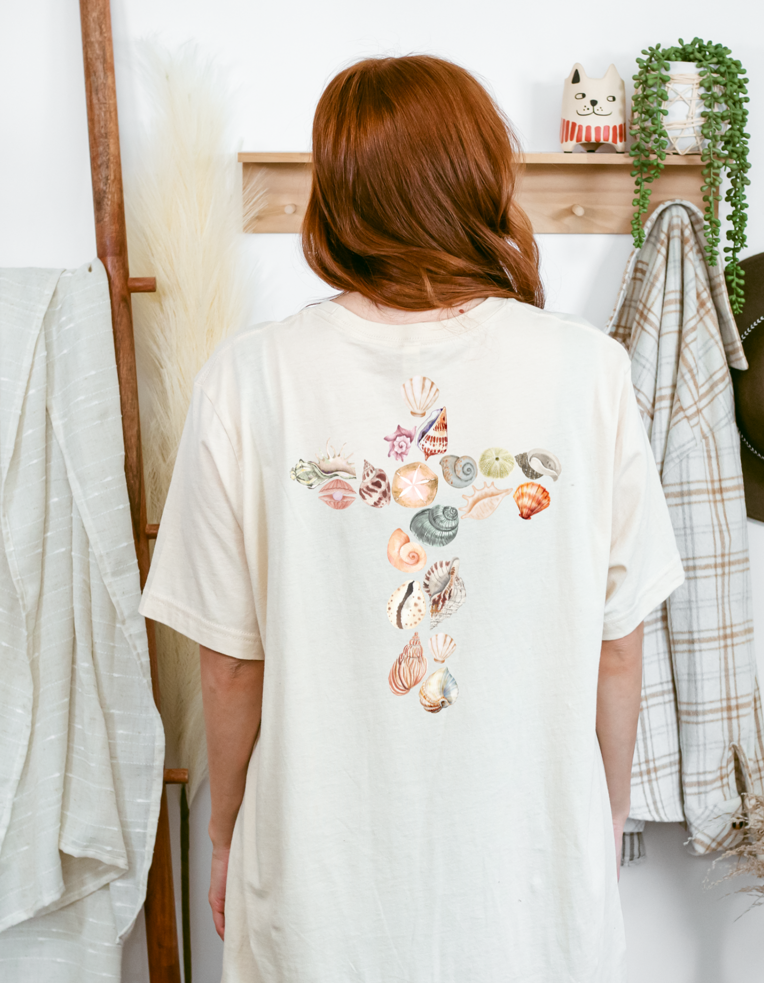 This beachy tee features a delicate seashell cross — a reminder that God’s presence is as constant as the tide. Simple, serene, and full of salt + soul.